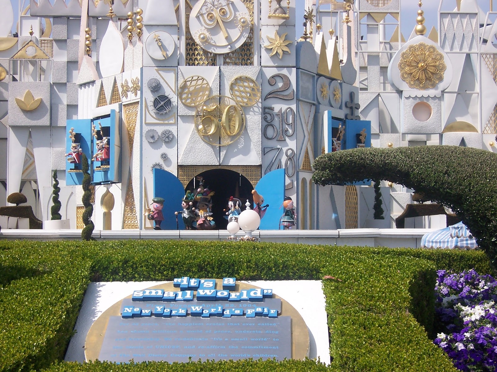 The Sherman Brothers’ first version of the “it’s a small world” song was played as a ballad. Walt requested something more cheerful, so the song was sped up and sung as a round. At the first presentation to Walt, the brothers performed the song while walking through a scale model of the attraction, singing and clapping their hands. Walt was delighted, and that song became the famous “it’s a small world (after all)” tune. (Thanks to the Wikipedia article for simplifying this summary for me.)